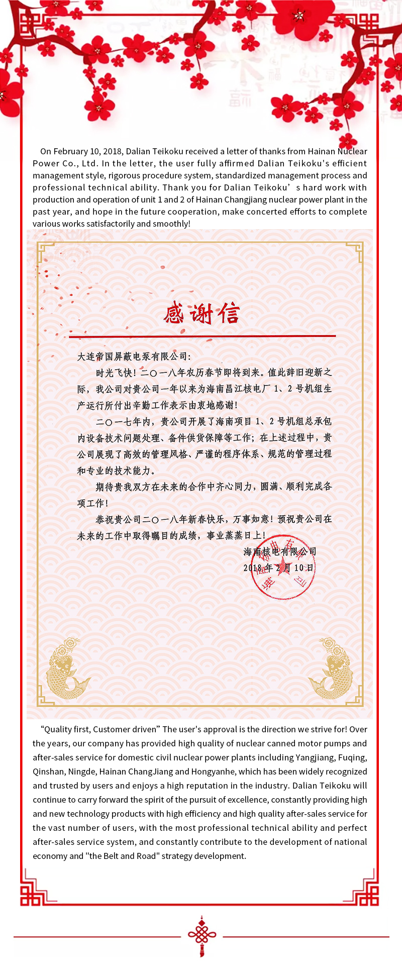 Dalian Teikoku’s professional technical ability and management system have been highly praised by the users of Hainan nuclear power