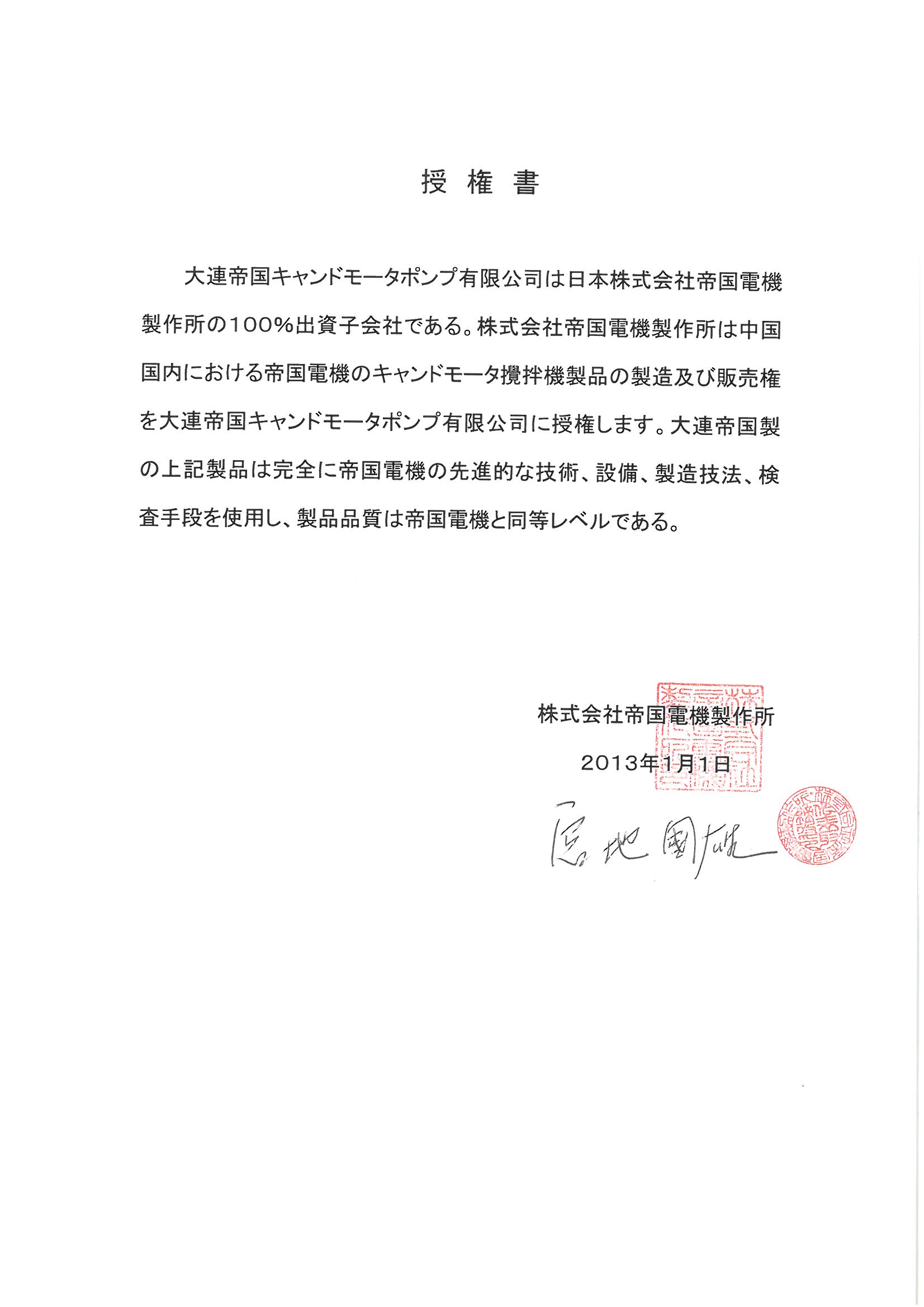 中国市場における当該製品のニーズを今後も最大限に満足させ、そしてまた中国国内での販売網および販売後のサービス体系を構築するため、株式会社帝国電機制作所は2013年1月1日以降、帝国電機製のキャンドモータ攪拌機の中国での独占代理販売権を大連帝国キャンドモータポンプ有限公司に授与することを決定しました。