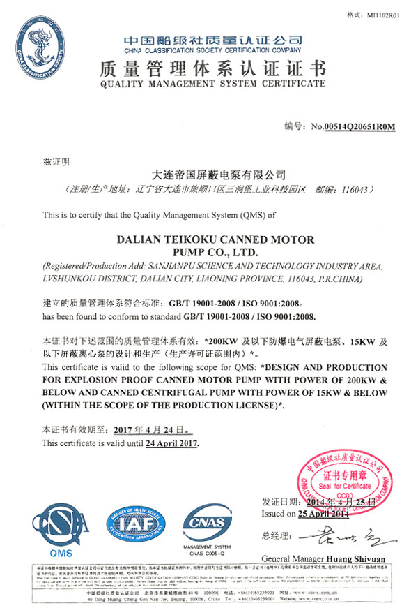 2014年4月25日,我公司通过了中国船级社(CCS)GB/T19001-2008/ISO9001:2008质量管理体系认证。
