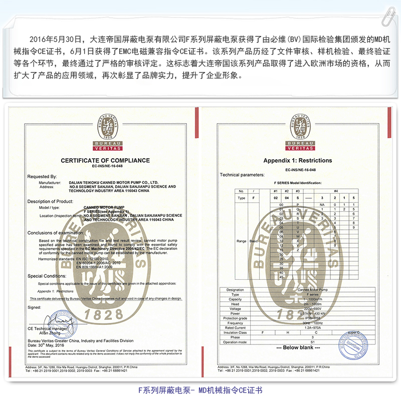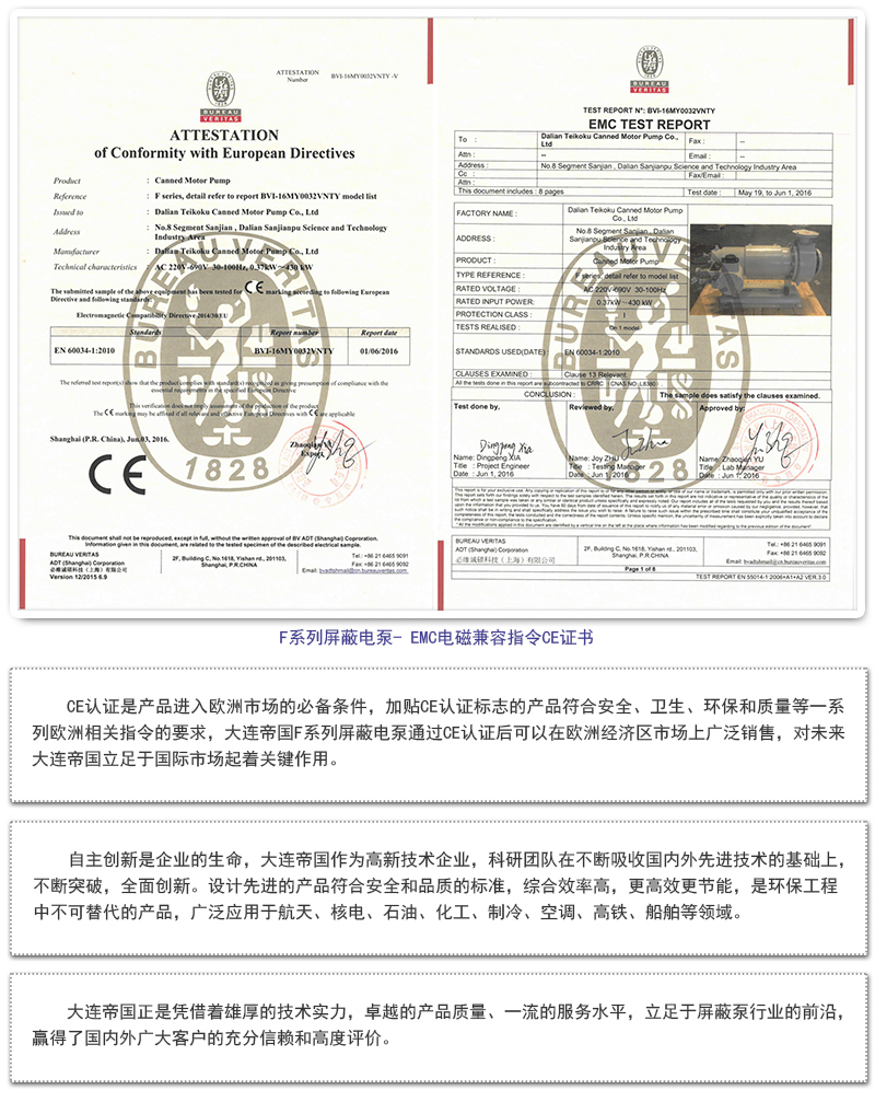 大连帝国F系列屏蔽电泵获得欧盟CE认证