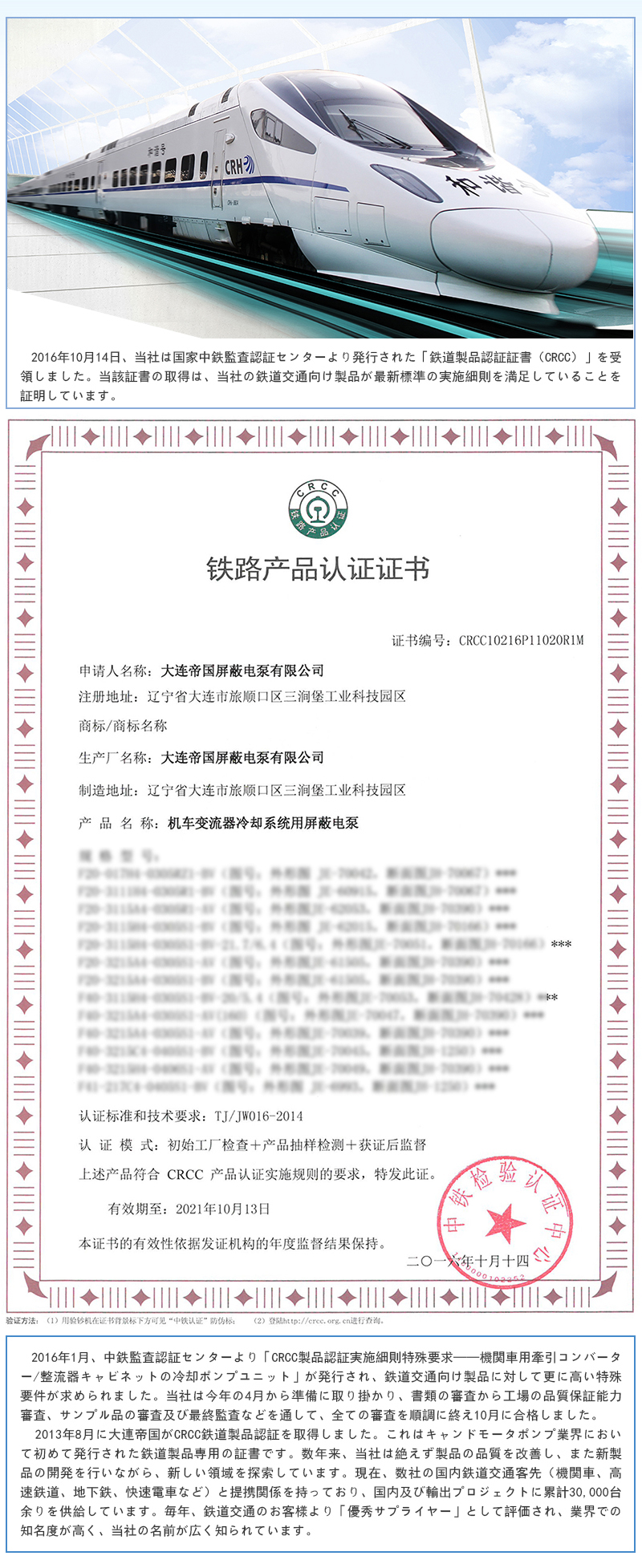 当社は鉄道向け製品のCRCC再認証に合格