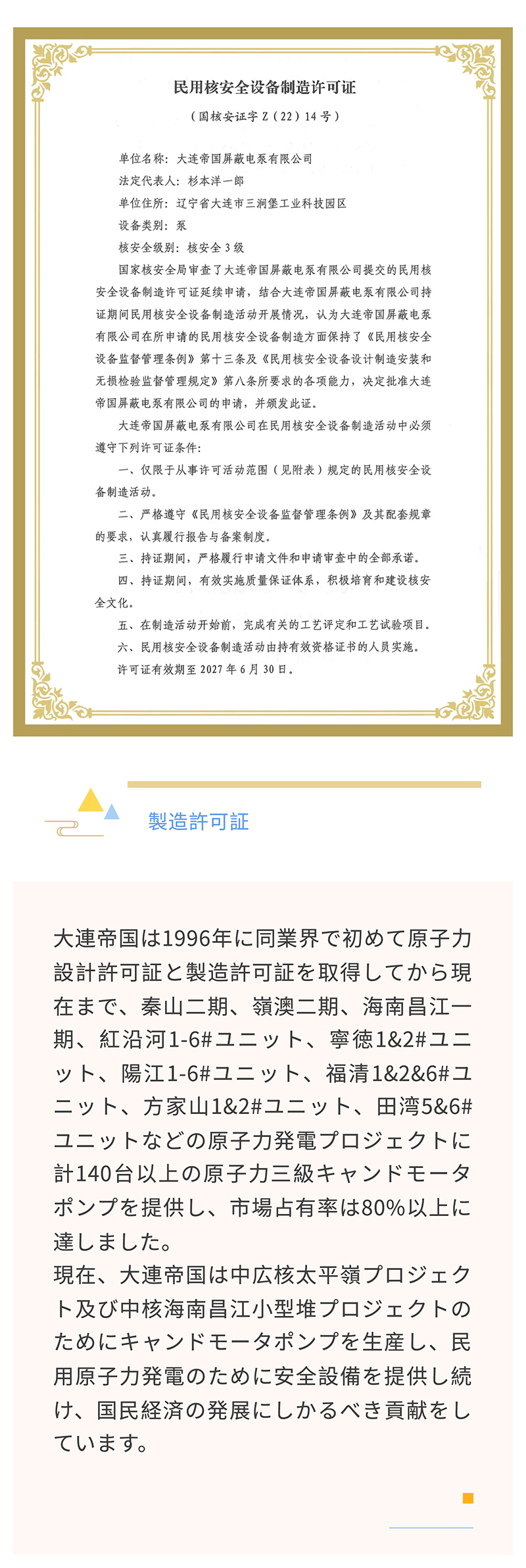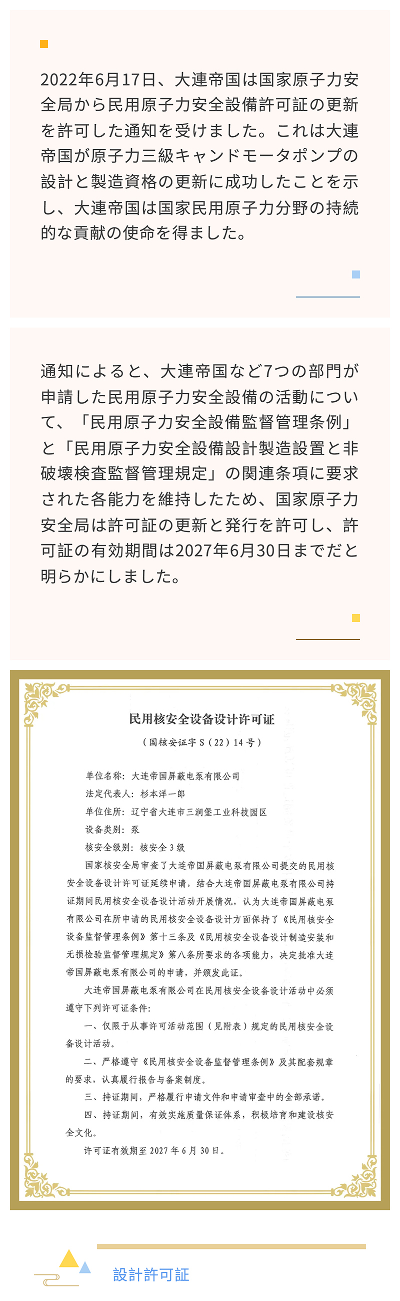 大連帝国民用原子力安全設備許可証の更新に成功